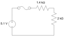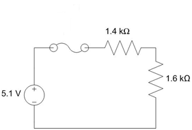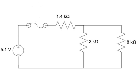 Solve: When the switch is open, no current gets to the 8-kΩ resistor and therefore it has no effect on the circuit. If we model the fuse as a wire (since we will assume it is not blown) and remove all hanging wires/components, the circuit simplifies to the circuit below: a 5.1-V source in series with the 1.4-kΩ and the 2-kΩ resistors.
