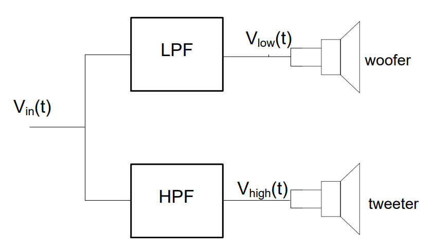 The low pass filter (LPF) is used to feed the woofer, since it blocks the high frequencies and allows low frequencies to pass. Likewise, we use the high pass filter (HPF) to feed the tweeter, since it passes the high frequencies and blocks the low.