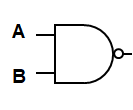 The symbol for a NAND gate is shown below. Note the only difference between the AND and NAND symbols is the small circle on the front to indicate the NOT operation after the AND operation.
