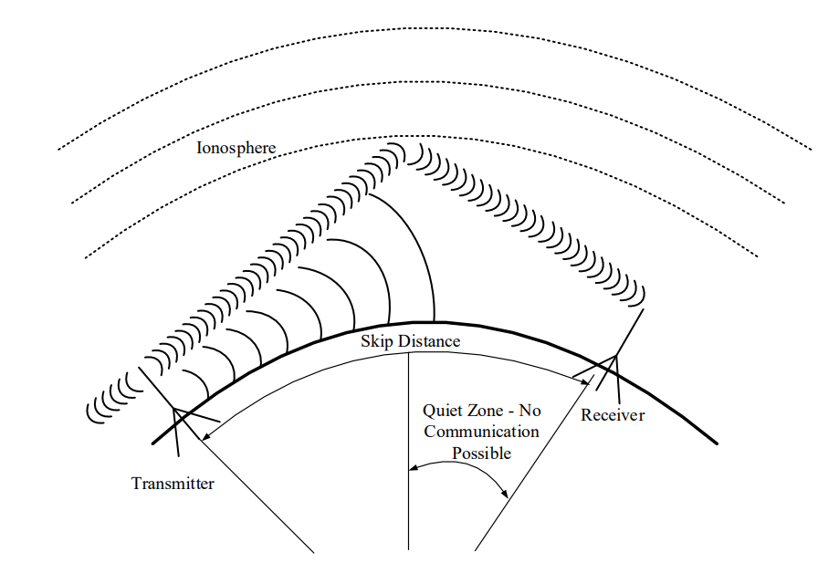In the HF band, where surface wave propagation is somewhat less than 200 miles, there is often a considerable distance in which essentially no radiated energy from either the surface wave or the sky wave is present and no communication is possible. This region is called the quiet zone. Figure 5 below illustrates the concepts of skip distance and quiet zone.