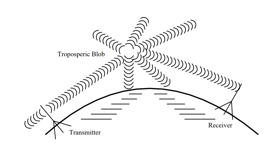 Forward Scatter Propagation: When a radiated signal strikes the discontinuous “blobs” of air in the troposphere, it is scattered in various directions. Some of this scattering is in the forward direction, and the resulting radio signal, although relatively weak, can be received at a point that is beyond the horizon from the transmitter. Most of the Air Force’s non-satellite wideband long haul communications use forward scatter (with carriers in the 300 to 400 MHz range).