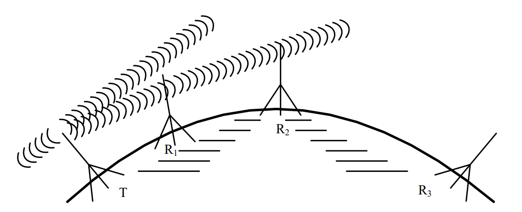 Line-of-sight (LOS) Propagation: All electromagnetic energy (to include all the RF bands) will propagate by LOS. If you, the transmitter, are in view of the receiver, then line-of-sight is established, thus the name. In practice, this means that if nothing can obstruct the waves traveling directly between the transmitter and receiver, then line-of-sight propagation can occur. As shown in Figure 2, LOS communications on the earth are limited by the curvature of the earth and the heights of transmitting and receiving antennas. Of course, transmitter power is also a limiting factor. The signal transmitted from point T reaches the receiving antennas R1 and R2. However, R3 is not in the LOS path of the signal and cannot receive any of the radio’s energy. For communication and telemetry between earth and space vehicles, LOS propagation is used. At short distance, secure military communications commonly occur through LOS microwave links. Some telephone company “trunks” and cell phone towers also use LOS.