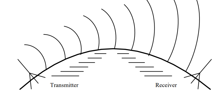 Surface Wave Propagation: In surface wave propagation, the radio wave travels from the transmitting antenna to the receiving antenna along the surface of the earth. This wave essentially diffracts around the surface of the earth, so you can reach distances greater than LOS. In this waveguiding process, minute eddy currents are induced in the ground directly beneath the surface wave. Although the ground is a fairly good conductor, it does have some resistance and the energy required for these currents to flow is absorbed from the wave. This in turn limits how far the wave can effectively travel.
