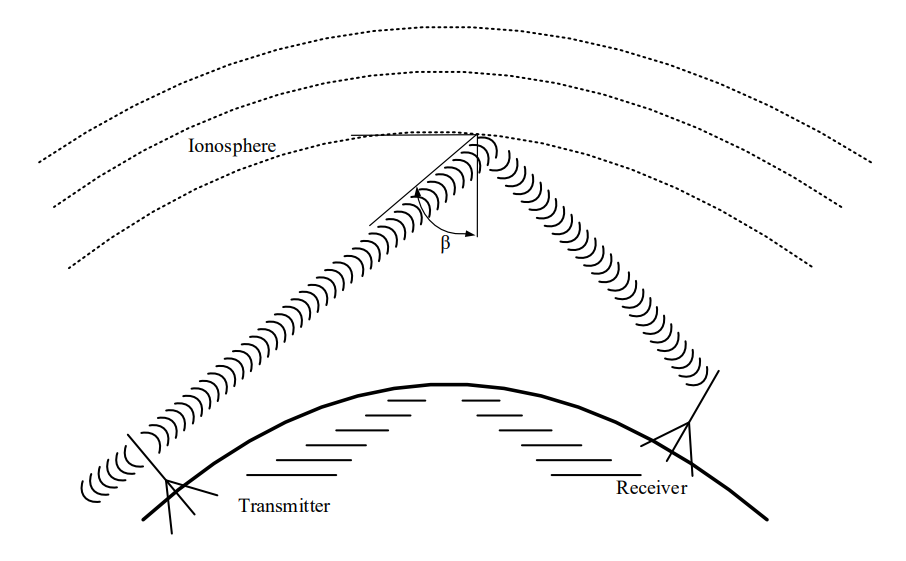 Sky Wave Propagation: Radio energy reflected or refracted from the ionosphere back to Earth is known as a sky wave. To understand how the ionosphere affects radio waves of different frequencies, think of the ionosphere as a huge mesh sieve surrounding the earth. Whether or not a wave passes through this sieve depends partially upon the relative dimensions of the wavelength and of the mesh openings. Therefore, radio energy with a long wavelength (low frequency) is more likely to be reflected back to Earth than that with a short wavelength (high frequency), which will pass through the mesh. In addition to frequency, the angle of incidence, β in Figure 4 below, plays a role in determine if the radio energy will be reflected back to Earth.